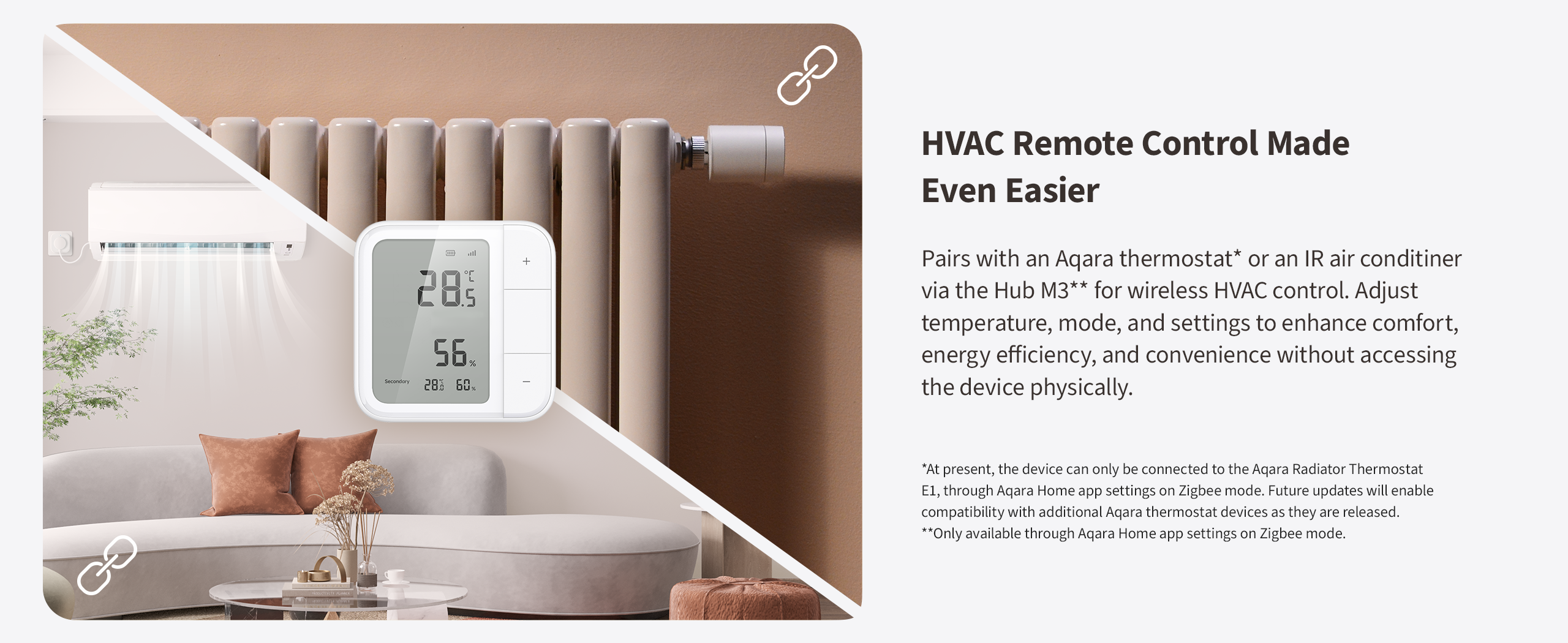 - HVAC Remote Control Integration: The sensor can be paired with an Aqara thermostat⑦ via an Aqara hub OR a third-party IR air conditioner via Aqara Hub M3 to enable wireless remote control of the HVAC system. This allows you to adjust the temperature, humidity, mode, and other settings directly from the device, automatically adjusting the environmental comfort and improving energy efficiency without actually visiting the HVAC unit.