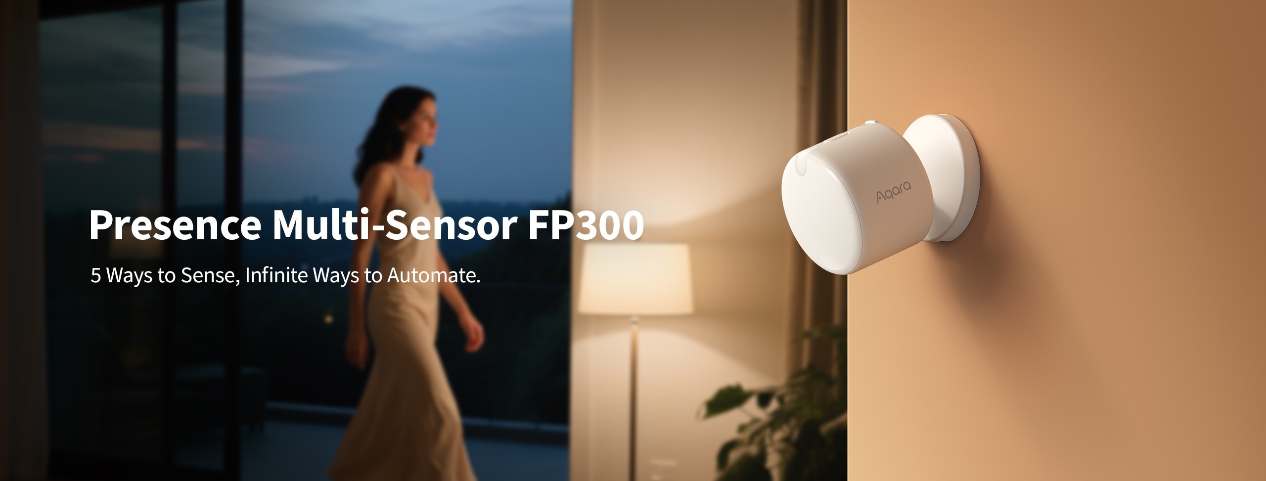 Experience the battery-powered Aqara Presence Multi-Sensor FP300 with AI dual PIR + mmWave detection, Thread & Zigbee support, and 5-in-1 smart sensing for precise home automation.