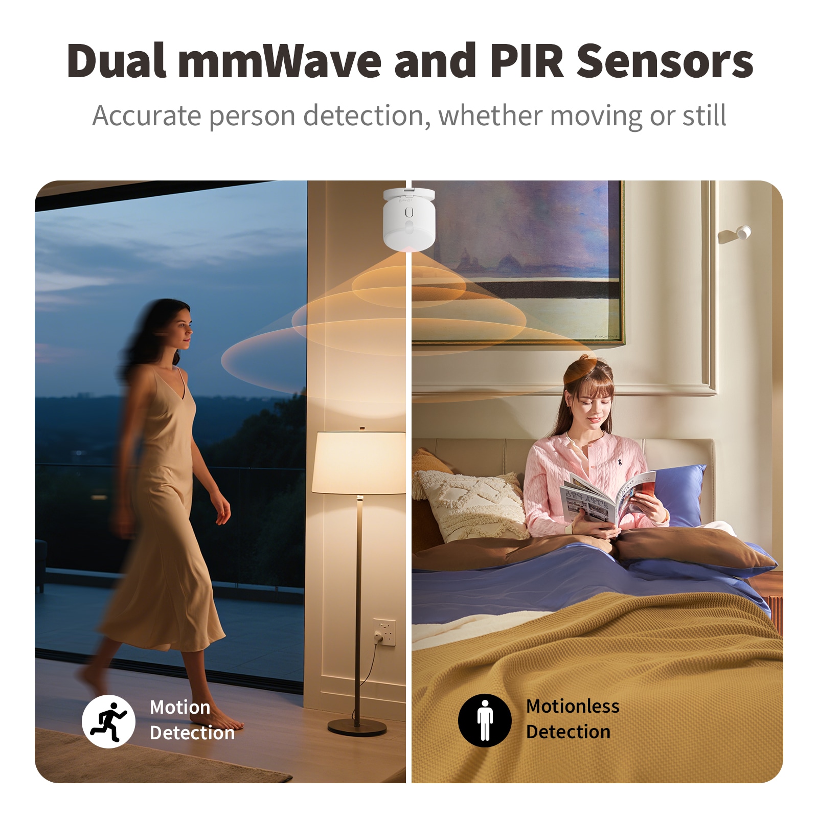 A pioneering battery-powered presence sensor with AI-powered dual PIR and mmWave detection and Thread/Zigbee support. Easy to install, it includes additional light, temperature, and humidity sensors, enhancing control, efficiency, comfort, and security in smart homes.