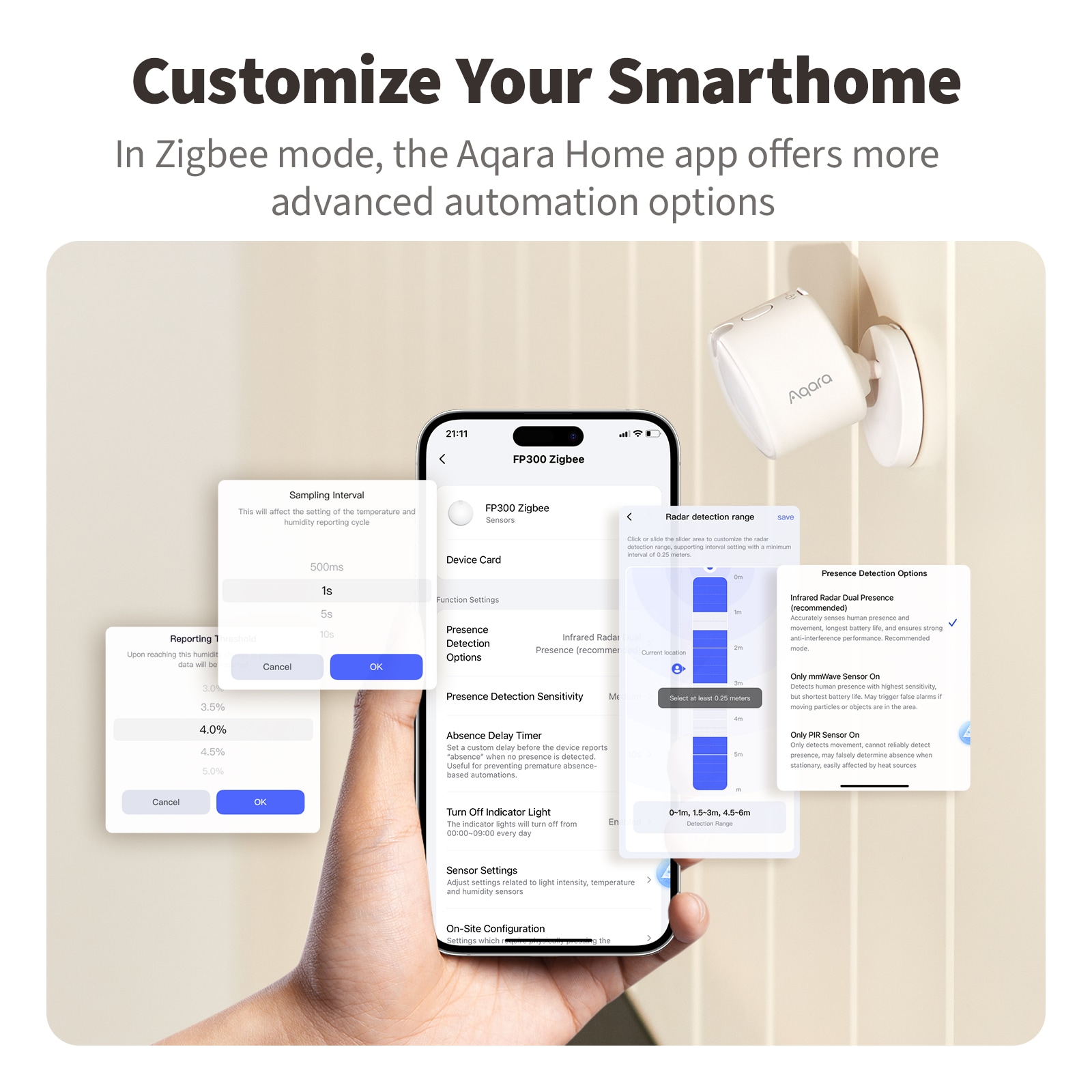 - Aqara Home Exclusive Features: In Zigbee mode, FP300 can achieve rich custom settings through the Aqara Home app, whether you are a smart home starter or an advanced user, you can quickly get started. You can freely enable or disable different sensors, and adjust key parameters such as sensing range and delay duration according to actual needs, so that the device can better fit your living environment or complex automation scenarios, creating a truly personalized smart experience.