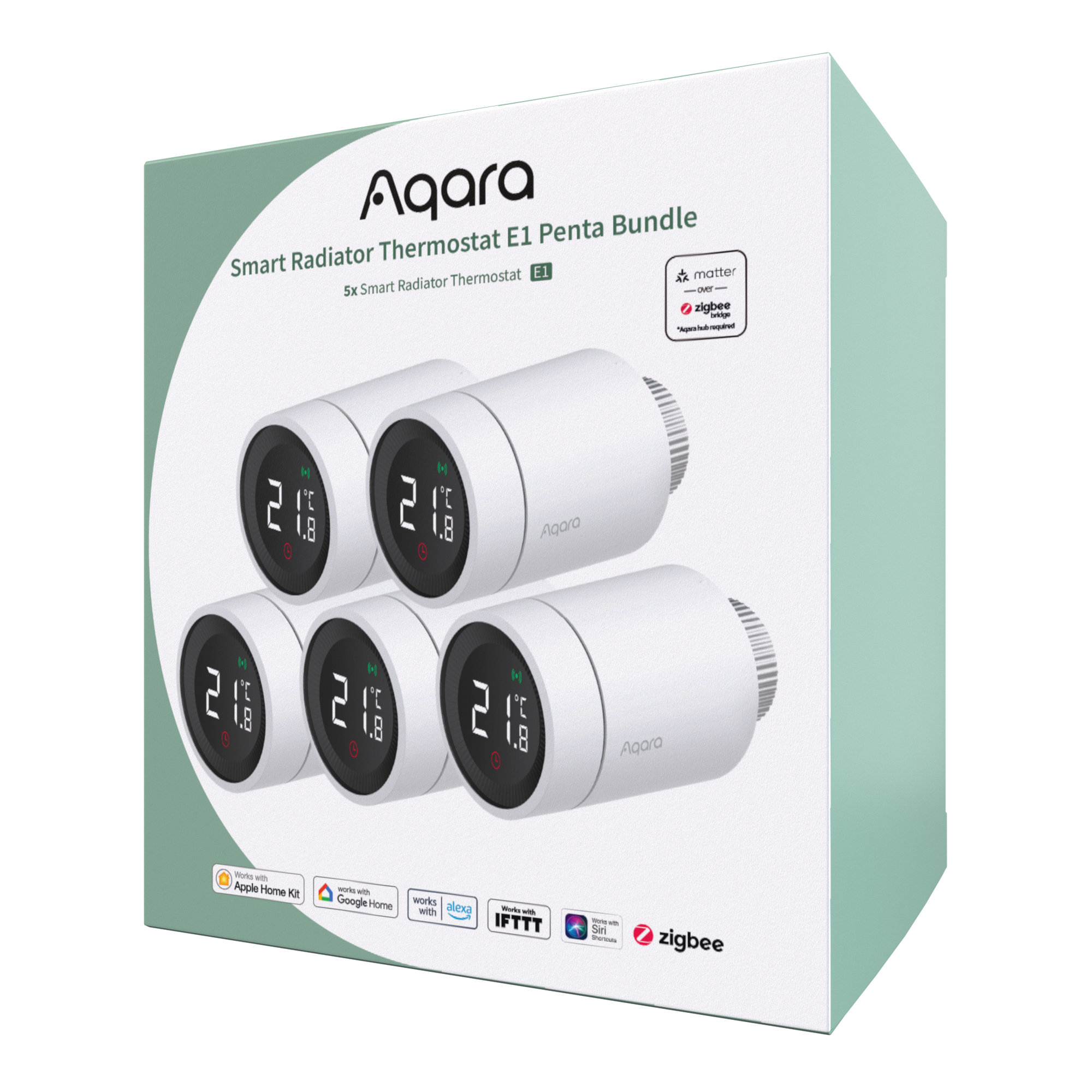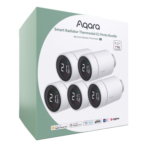 This bundle included 5 Aqara Radiator Thermostat E1. The Radiator Thermostat that can be used with the majority of water radiators* such as space heaters, towel warmers or even warm floors. Takes the readings from external Aqara sensors and adjusts the heating power according to them.