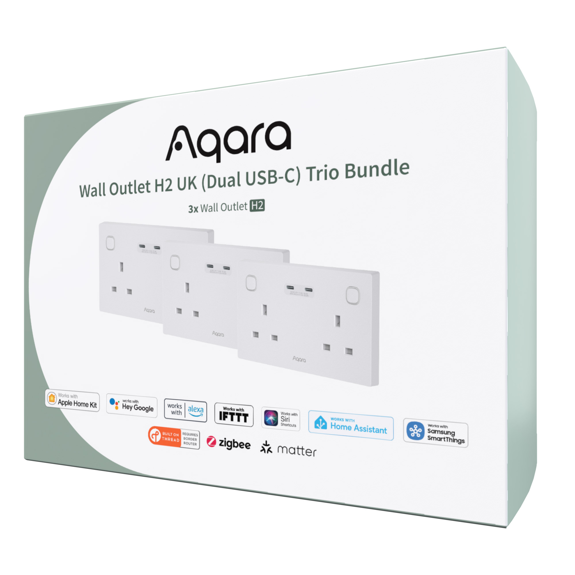 Aqara Wall Outlet H2 UK Trio Bundle with dual USB-C fast charging, Matter-ready Thread & Zigbee support, independent control, power monitoring and built-in safety.